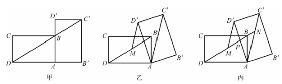 18、小王在学习浙教版《义务教育教科书数学九年级上册》第72页例2后,进一步开展探究活动:将一个矩形ABCD绕点A按顺时针方向旋转α(0°<α≤90°),得到矩形AB'C'D',连结BD.(1)、如图甲所示,当α=90°时,点C'恰好在DB延长线上.若AB=1,求BC的长.(2)、如图乙所示,连结AC',过点D'作D'M∥AC'交BD于点M.线段D'M与DM相等吗?请说明理由.(3)、在(2)的条件下,射线DB分别交AD',AC'于点P,N(如图丙所示),发现线段DN,MN,PN存在等式数量关系,请写出这个等式,并加以证明.