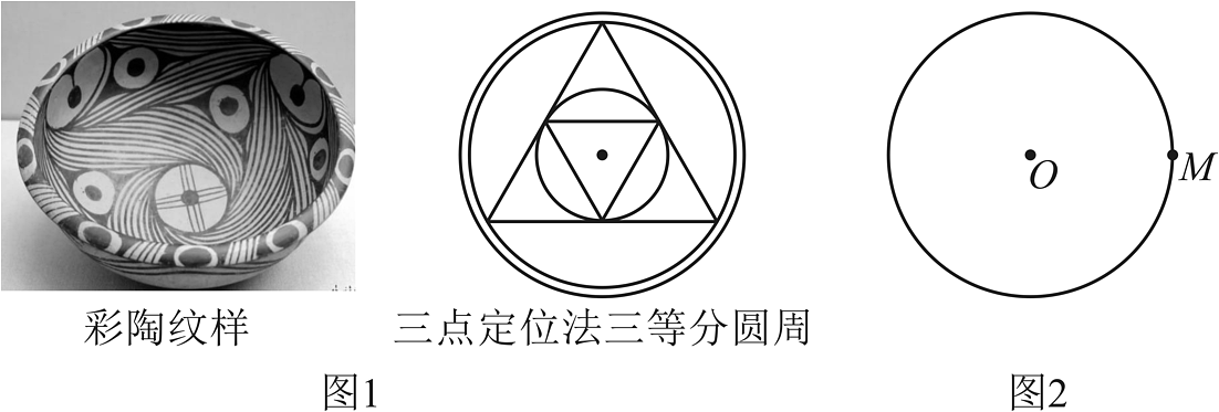 20、马家窑文化以发达的彩陶著称于世,其陶质坚固,器表细腻,红、黑、白彩共用,彩绘线条流畅细致,图案繁缛多变,形成了绚丽典雅的艺术风格,创造了一大批令人惊叹的彩陶艺术精品,体现了古代劳动人民的智慧.如图1的彩陶纹样呈现的是三等分圆周,古人用等边三角形三点定位的方法确定圆周的三等分点,这种方法和下面三等分圆周的方法相通.如图2,已知和圆上一点M.作法如下: