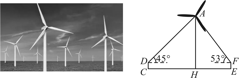 19、习近平总书记于2021年指出,中国将力争2030年前实现碳达峰、2060年前实现碳中和.甘肃省风能资源丰富,风力发电发展迅速.某学习小组成员查阅资料得知,在风力发电机组中,“风电塔筒”非常重要,它的高度是一个重要的设计参数.于是小组成员开展了“测量风电塔筒高度”的实践活动.如图,已知一风电塔筒垂直于地面,测角仪 , 在两侧, , 点C与点E相距 (点C,H,E在同一条直线上),在D处测得简尖顶点A的仰角为 , 在F处测得筒尖顶点A的仰角为 . 求风电塔筒的高度.(参考数据: , , . )