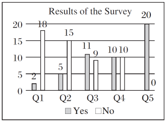 (1)、How many students took the survey?A、Ten. B、Eighteen. C、Twenty. D、Five.(2)、____ of the students are late for school.A、25% B、50% C、10% D、100%(3)、In which question do the students have the same result?A、Q1. B、Q2. C、Q4. D、Q5.(4)、The survey is about ____.A、students' life B、students' sports C、students' hobbies D、students' love -