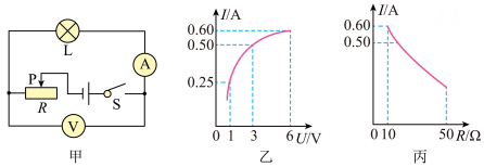 9、如图甲所示,电源电压不变,灯泡L 允许通过的最大电流为0.6A,滑动变阻器R的最大阻值为50Ω,电流表量程为“0~0.6A”,电压表量程为“0~15V”。闭合开关S,在保证电路安全的前提下,最大范围调节滑动变阻器的滑片P,分别绘制了电流表示数与电压表示数、电流表示数与滑动变阻器R连入电路阻值的变化关系图像,如图乙、丙所示。求:(1)、当电路中电流为0.25A时,小灯泡的电阻为多少?(2)、电源电压为多少?(3)、若将电压表量程换为“0~3V”,滑动变阻器允许连入电路的阻值范围是多少?