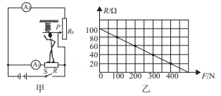 17、如图甲是科学兴趣小组在课外活动中设计的一种身高体重秤,体重、身高显示器是由电流表改装而成的,两个电流表满刻度都是0.6A.已知电源电压为12伏,R0为竖直固定放置的滑动变阻器,滑片P可以随身高的变化竖直上下移动,其接入电路的电阻与接入电路的长度成正比。R为压敏电阻,其阻值随压力变化关系如图乙。(1)、体重秤上不站人时,体重秤上的“0”刻度对应A上的电流是多少?(2)、该秤的身高测量范围为125~175cm,电路中电流表A2示数相对应的变化范围为0.1A~0.6A.请计算:滑动变阻器R的滑片P每滑动1cm时阻值变化多少?(3)、该秤的电源使用时间过长后电压会变小,如果电源电压变为10.8V时,用该身高体重秤测得某位同学的身高为170cm,则这位同学的实际身高为多少cm?