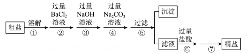 (1)、步骤⑥中加入过量盐酸的目的是。(2)、实验过程中会产生种沉淀。(3)、步骤②和步骤④不可以颠倒,理由是。(4)、同学提出精盐中的 NaCl 比原来粗盐中的多,简要说明。 -