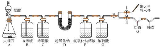 18、 超氧化钠(NaO2)在常温下能分别与CO2、H2O、HCl发生反应,均可生成O2。为了验证能跟 反应生成O2 , 某兴趣小组的同学设计了如图所示实验。(已知:超氧化钠能与水反应生成氢氧化钠和氧气;稀盐酸具有挥发性)。(1)、和二氧化碳反应生成氧气和一种白色固体,则该白色固体可能是____(填字母);A、NaCl B、NaOH C、 D、(2)、推测B装置中X溶液的作用是;(3)、实验结束后,某同学取少量D中固体,加足量水,有气泡产生。为验证所得溶液中含有氢氧化钠,请你帮助这位同学写出后续的实验操作与现象。