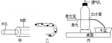 16、学校科技节开展“水流光纤”实验探究,同学们查阅资料得知:图甲是光纤的结构图,图乙是光在光纤中传播的原理图。某科学小组利用透明塑料瓶、激光笔、清水等材料用水流模拟光纤:在距瓶底10cm处开-直径2mm的小孔(接出水管),注满水后形成稳定弯曲水流。用红色激光笔从瓶的另一侧对准小孔照射(如图丙所示),观察实验现象。(1)、由图甲与图乙分析,光在光纤中传播的主要原因是光的(填“折射”或“反射”)。(2)、在图丙水流光纤的模拟实验中,随着瓶内液面下降,出水管流出的水越靠近瓶身的原因是。(3)、若图丙所示装置能成功用水流模拟光纤,则将会观察到的实验现象为。