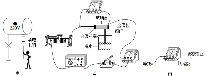 15、给如图甲所示的电热水器金属内胆出水口加接一段长管道,由于长管道中水柱具有电阻(简称“隔电电阻”),在电热水器漏电且接地线失效时,能形成“防电墙”保障人的安全。为了探究“隔电电阻”阻值大小的影响因素,某校兴趣小组利用注水的玻璃管模拟“隔电电阻”,设计如图乙所示电路,进行如下实验。