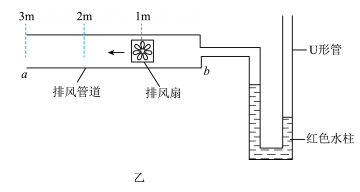 ②将盛有红色水柱的U形管与排风管管口b端连接。