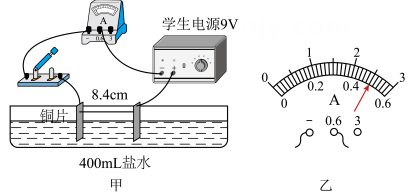 17、项目小组探究液体电阻的影响因素的实验,在水槽中相距8.4cm的两侧放入铜片,铜片竖直固定能平移,将铜片和电压为9V的电源、电流表及开关串联。向水槽中加入一定浓度的盐水,闭合开关,读出电流表示数。改变加入盐水的浓度和铜片距离,重复上述实验。