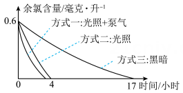 16、水质对水族箱内鱼的生存至关重要,定期监测和维护水质有利于鱼的生存。(1)、自来水消毒后残留的氯称为余氯,其对鱼有害。某研究者用三种不同的方式去除余氯,其效果如图所示。据图,小明采取方式二去除余氯,其理由是。(2)、水族箱在使用过程中需要补充氧气,常用的方法有增加水草或投放增氧剂。