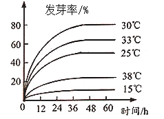 (3)、苦瓜种子种皮厚且硬,直接播种后出土困难。某科研小组统计了不同时间、不同温度下苦瓜种子的发芽率(如图)。结合图像信息可知,为了提高苦瓜种子的发芽率,在播种前除了用赤霉素处理外,还需对种子进行如何处理?。 -
