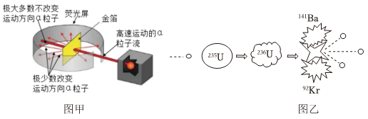 资料2:1938年末,德国科学家哈恩用慢中子来轰击铀核,反应迅速并释放大量能量,铀分裂成一些原子核更小的元素,模型如图乙。
