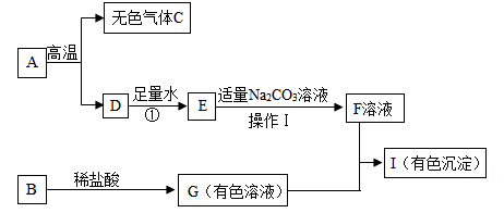 1、下列框图中的物质均为初中科学常见的物质,其中A是建筑材料的主要成分,B是金属氧化物,C是能使澄清石灰水变浑浊的气体,下图是它们之间的相互转化关系,请回答下列问题。(1)、写出C物质的化学式。(2)、 操作Ⅰ的名称为。(3)、若I是红褐色沉淀,请写出G+F→I的化学方程式。