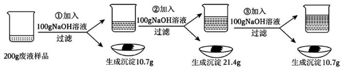 16、航母舰体需要定期除锈维护,为实现对除锈废液(溶质主要成分为HCl、FeCl3 , 其他杂质忽略)的综合利用,需测定废液中HCl的质量分数。取200g废液样品,依次加入100g溶质质量分数相同的NaOH 溶液,过滤,称重,相关数据如图。回答下列问题。(1)、第③次过滤后,滤液中溶质的成分为 (用化学式表示)。(2)、所用NaOH 溶液溶质的质量分数(写出计算过程)。(3)、废液样品中 HCl的质量。