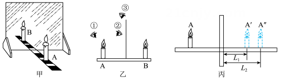 (1)、选用两根完全相同的蜡烛A、B的目的是:;在实验时蜡烛B始终无法与蜡烛A的像重合,请你帮他分析可能出现这种现象的原因:;(2)、为确定像的虚实,需在蜡烛B位置放一个光屏,并在图乙中的(选填数字序号)处观察光屏上是否有像;(3)、小明为了更好地研究像与物的位置关系,采用了彩色LED 光源进行实验,现有“A、F、M、T、V、X”六种字母形状的光源供选择,你认为最佳选择是(选填字母); -