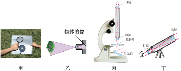 9、科学家们利用巨大的天文望远镜观察、接收来自宇宙的信息,让人们对宇宙的了解越来越多。这项伟大的事业与小小的透镜密切相关,下列有关透镜的知识说法错误的是()A、甲图把放大镜正对着太阳,可在纸上发现一个很小、很亮的光斑,说明凸透镜对光有会聚作用 B、乙图用照相机给物体照相时,物体离照相机镜头较远,像离镜头较近,像成在焦点以内 C、丙图显微镜的物镜成像原理和投影仪的镜头成像原理一样 D、丁图望远镜目镜的作用相当于一个放大镜