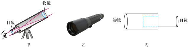 望远镜有不同类型,其中有一种望远镜是由两组凸透镜组成的(如图甲所示)。靠近被观测物体的叫作物镜,作用是使远处的物体在焦点附近成(选填“实”“虚”)像,目镜的作用相当于一个(选填“照相机”“投影仪”“放大镜”)用来把这个像放大。(2)、活动任务二:设计简易望远镜