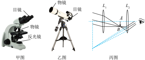 4、如图所示中的显微镜和望远镜用到了我们所学的很多光学知识。(1)、甲图是显微镜,它的反光镜有一面是凹面镜,它对光起到作用(选填“会聚”、“发散”),可在光线较(“亮”、“暗”)时使用;(2)、乙图是望远镜,图丙表示它的原理,图中是物镜,是目镜。分析原理图可知物镜成倒立缩小实像,相当于的镜头(选填“放大镜”、“投影仪”或“照相机”);目镜的作用主要是将物镜所成的像放大,以(选填“增大”或“减小”)视角。