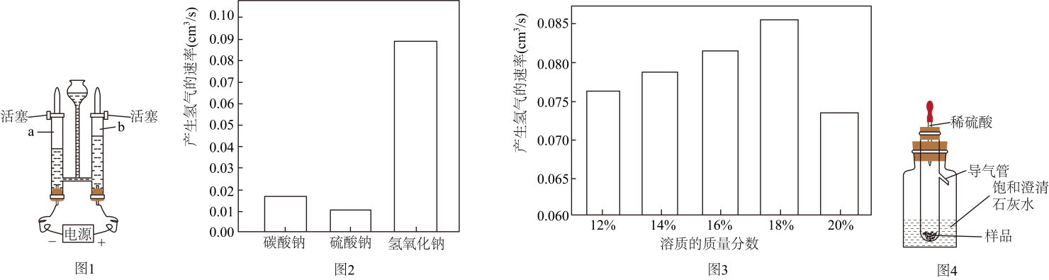 16、某小组用图1装置开展电解水实验的相关研究。(1)、甲分别取等质量的碳酸钠、硫酸钠、氢氧化钠溶液,溶质质量分数均为12%,在相同条件下进行电解水实验,产生氢气的速率如图2所示。由此可知,在相同条件下,加入 , 产生氢气的速率最大。(2)、乙取不同质量分数的氢氧化钠溶液,在相同条件下进行电解水实验,其结果如图3所示。据图可知,产生氢气速率的变化趋势为。(3)、丙从实验室取用了一瓶久置的氢氧化钠固体,在相同条件下进行实验,发现产生氢气的速率比乙同学的小。丙猜想速率变小的原因可能是氢氧化钠变质,请写出氢氧化钠变质的化学反应方程式。为了验证猜想,他设计了如图的实验装置(图4中试管带有导气管),当他滴加稀硫酸时,观察到瓶中的饱和澄清石灰水变浑浊,他认为猜想正确。同学们讨论后发现,该设计方案不够严谨,其原因是。如何改进?他们继续思考…
