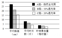 (1)、为控制本实验研究的无关变量,实验中采取的措施有(写出一点)。(2)、C组株高显著低于 A 组,是由于叶肉细胞中较少,导致光合作用合成的有机物减少。(3)、分析图表数据,你能得出的结论有:(写出一点)。(4)、《齐民要术》提倡“向阳而种,苗盛穗实”,请结合实验结果说明其科学道理:。 -