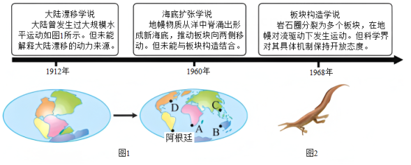 14、人类对地球表面大陆分布的演变经历了一系列的研究与探索。下图是历程中的部分观点:(1)、科学家在现代阿根廷地区发现了中龙化石如图2,依据“大陆漂移学说”,在图1中最有可能发掘出中龙化石的地方是。 (选填字母)(2)、中龙与现代鸟类、鳄鱼等有同样的祖先,但中龙却没有生存下来,这是的结果。(3)、上述三个“学说”都还属于“假说”,请你选择其中一个“学说”并说明其为“假说”的理由: 。