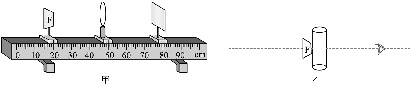 7、如图甲所示,光具座上从左到右依次为F光源、凸透镜、光屏,它们的中心大致在同一高度上。当三者分别处于光具座20cm处、50cm处、80cm处时,恰好在光屏上呈现一个清晰的像。请回答下列问题: