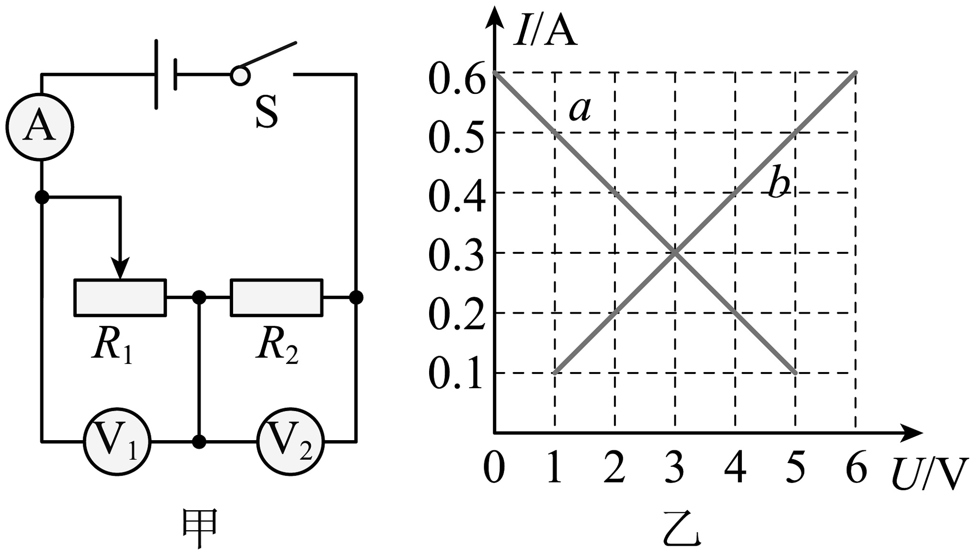 17、图甲是探究欧姆定律的实验电路,电源电压恒定,R1是滑动变阻器,R2是定值电阻;图乙中的a、b分别是将滑动变阻器R1的滑片从最左端移动到最右端的过程中,电流表A的示数随两电压表V1、V2的示数变化关系图象。下列说法中正确的是( )A、图线b是电流表A的示数随电压表V1的示数变化关系图象 B、当两只电压表的示数相等时,滑片在滑动变阻器的中点位置 C、电源电压是6V D、定值电阻阻值是1Ω