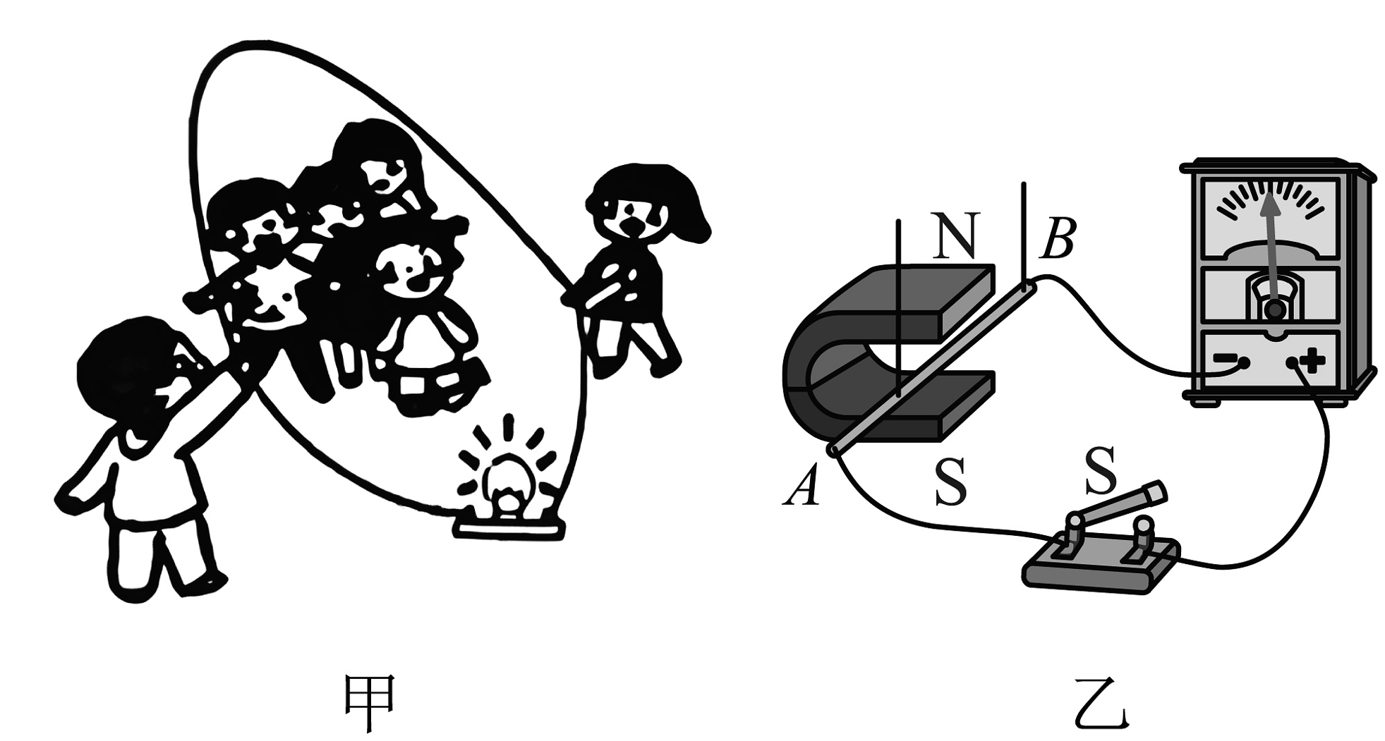 9、如图甲所示,操场上六位学生通过跳大绳(绝缘层内含导线),竟然能使一只小灯泡发光;六位学生产生了好奇心,在老师指导下开展了某电磁学实验(图乙);