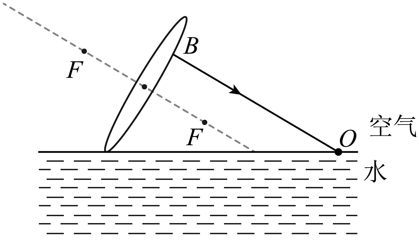 12、如图所示,透镜斜放,F为透镜的焦点,一条光线经透镜折射后,折射光线BO与透镜的主光轴平行,折射光线斜射向水面,请将此光路图补充完整。