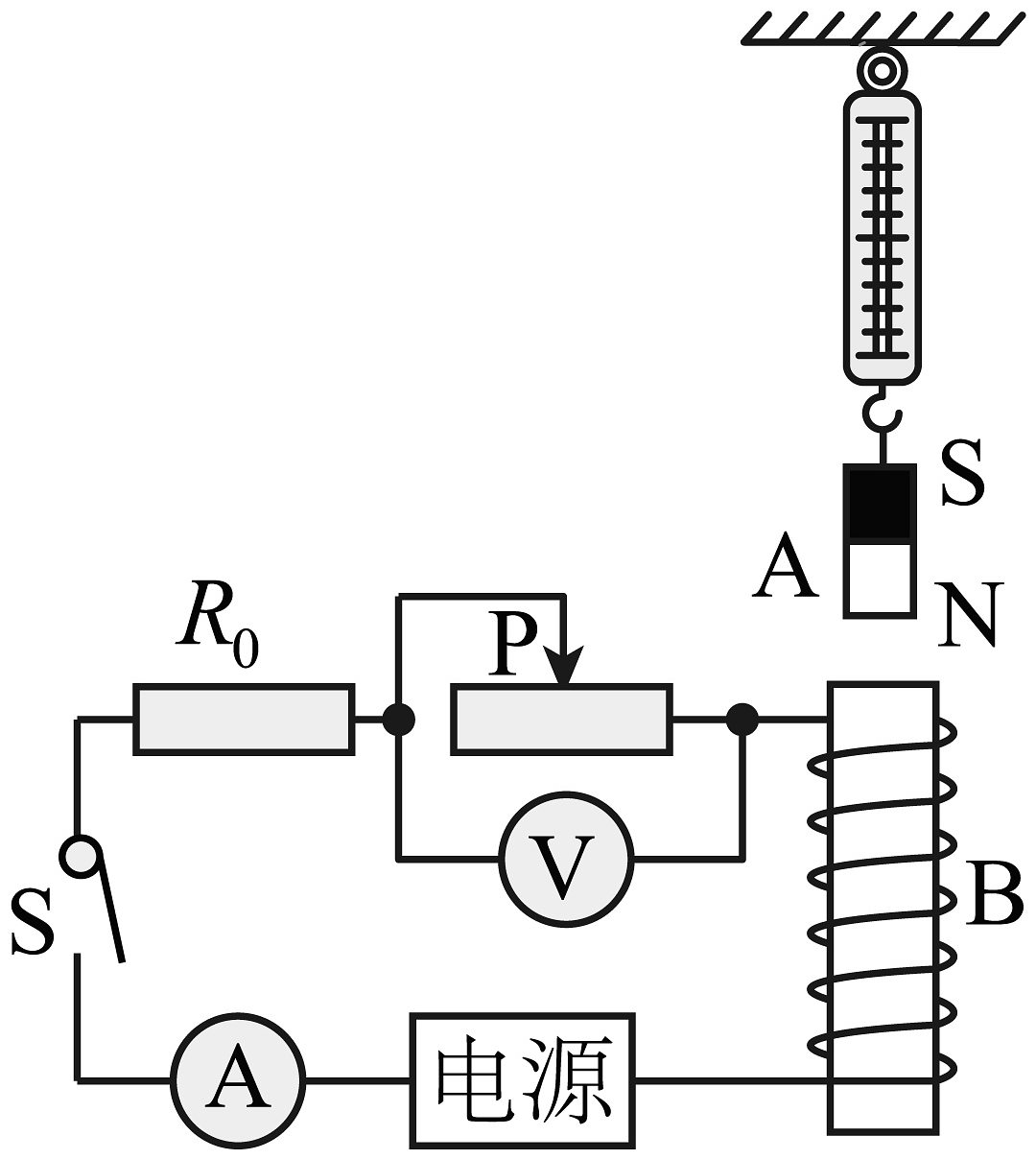 1、如图所示,A是悬挂在弹簧测力计下的条形磁铁,B是电磁铁。现闭合开关S,将滑动变阻器的滑片P向右移动时,弹簧测力计的示数变小。下列说法不正确的是( )A、该过程中,电压表示数减小 B、B的下端是S极,电源右端是正极 C、若减少B线圈匝数,滑片P向左移动时,弹簧测力计示数变大 D、若对调电源正负极,滑片P向左移动时,弹簧测力计示数变大