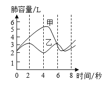 15、“新型冠状病毒”肺炎患者的主要临床表现有发热、咳嗽、喷嚏、胸闷、全身乏力等症状。(1)、“咳嗽”是由于异物侵入呼吸道或呼吸器官发生炎症而引起的保护性生理活动。咳嗽时,肺内气压外界气压(选填“大于”、“等于”或“小于”)。(2)、“喷嚏”是指鼻黏膜受刺激时,人急剧吸气,然后很快地由鼻孔喷出并发出声音的现象。如图曲线,符合打喷嚏时肺容量随时间变化的是(选填“甲”或“乙”).(3)、肺泡内的氧气通过作用,透过肺泡壁和毛细血管壁进入血液。