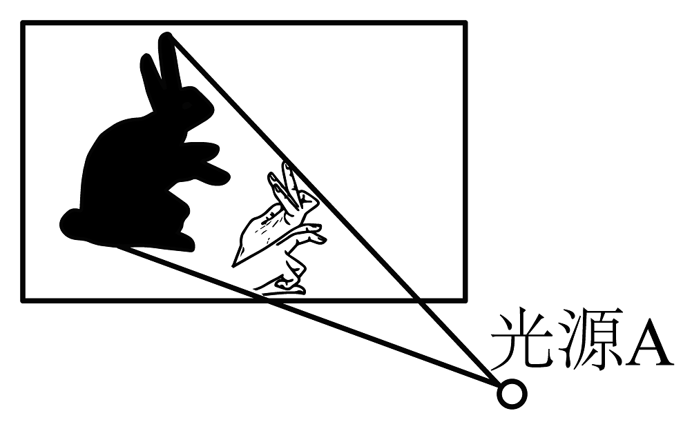 20、手影游戏是民间传统的儿童游戏。如图所示,在黑暗的房间内,将双手按一定手势放置在白色的背景板前,打开光源A,让一束白光照向双手,就能在背景板上看见“兔子”等动物的“影像”。回答下列问题: