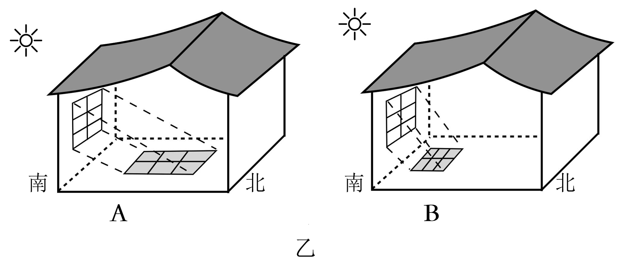 19、2024年6月22日﹣23日是浙江省初中毕业生学业水平测试的时间。回答下列问题:(1)、地球绕日公转的示意图如图甲,2024年6月22日这天,地球公转至图甲中(选填序号)位置附近:杭州的昼与夜的长短关系为。(2)、如图乙表示在一年中杭州朝南窗户在正午时太阳光照入面积最大和最小的示意图,则2024年6月22日这天正午太阳光照射情况更接近于图乙的(选填“A“或“B“)。