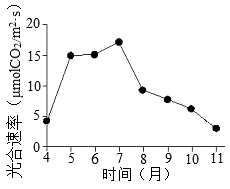 10、北京香山红叶林中主要树种就是黄栌。黄栌树叶在温度降低时会将叶绿素分解,叶片转为鲜艳夺目的红色。到了秋季,北京降水量会逐渐减少。园林工作者研究了该品种黄栌的光合速率(光合速率是指1平方米的叶片每秒消耗的二氧化碳量),得到结果如图所示。请综合题中信息及所学知识,分析8~11月份该品种黄栌的光合速率逐步下降的原因。