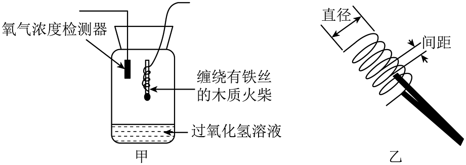 4、学习小组同学在做完铁丝燃烧实验后对此产生浓厚兴趣,他们利用如图甲所示装置探究铁丝燃烧时间的影响因素。集气瓶中装有过氧化氢溶液,加入二氧化锰后,利用检测器检测反应前集气瓶内的氧气浓度,待检测器数值稳定后,将绑有燃着小木条的不同螺旋直径的铁丝伸入瓶中。观察到铁丝燃烧分为剧烈燃烧和缓慢燃烧两个阶段,其中缓慢燃烧阶段现象为:铁丝先变红,后变暗,瓶底出现黑色固体。多次实验获取数据后取平均值记录如下表。