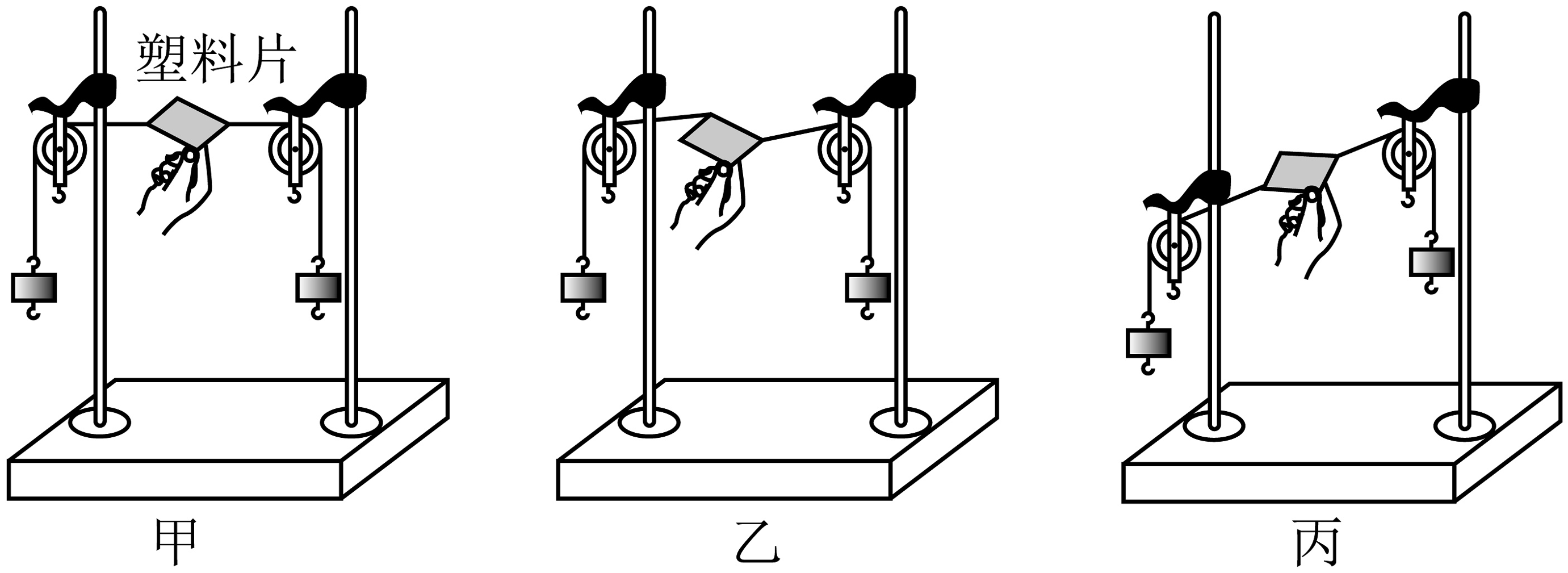 (3)若左端的滑轮向下移动一段距离后,调整塑料片的位置如图丙所示,请你判断手放开后塑料片将。