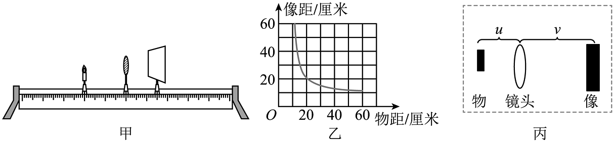 4、小科利用图甲装置探究凸透镜成像规律,将实验所得数据绘制成图像,如图乙所示;
