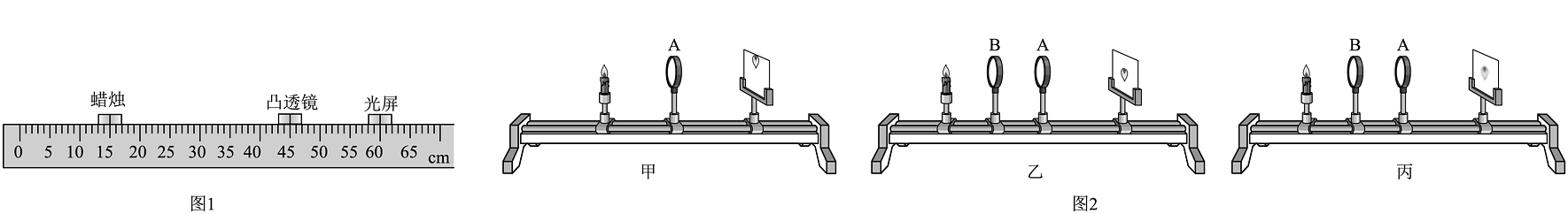 (3)实验一段时间后,发现原来成在光屏中央的像,“跑”到图2中甲所示的位置(靠近光屏上沿)。若想让像重新回到光屏中央,可以将蜡烛(填“调高”或“调低”)适当距离;