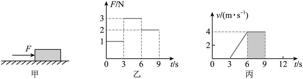 12、如图甲所示,放在水平地面上的物体受到方向不变的水平推力F的作用,F的大小与时间t的关系图像如图乙所示,物体运动速度v与时间t的关系图像如图丙所示。