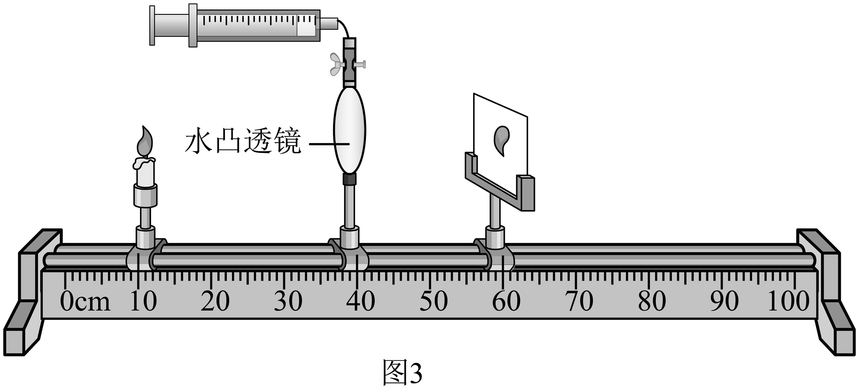 (5)小东同学用自制的水凸透镜来模拟探究眼球晶状体变化规律,在光屏上得到了清晰的像,如图3所示。此时,若将蜡烛靠近水透镜时,为了使光屏上仍能成清晰的像,应该向水透镜中(填“注水”或“抽水”)。