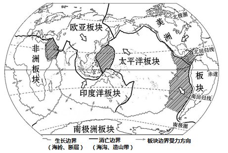 14、如图是地球板块示意图,根据板块构造学说可知( )A、地球表面的陆地被海岭和海沟分割成七大板块 B、火山与地震带都分布在各大板块的中央 C、我们生活的杭州位于亚欧板块 D、青藏高原是由亚欧板块与非洲板块碰撞形成