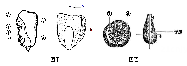 8、图甲为玉米种子的剖面图,图乙为某双子叶植物子房剖面图,据此回答下列问题:(1)、图甲的剖面图是刀片沿着(选填“a”、“b”或“c”)线剖开的,在图甲剖面滴上碘液,变蓝色的部位是(填数字序号),构成结构⑤的表皮细胞形成组织。(2)、玉米种子和菜豆种子结构的主要区别是(填数字序号)的数量,结构②在种子萌发的过程中将发育为。(3)、图乙的剖面图是刀片沿着(选填“d”或“e”)线剖开的,结构⑦将发育为。