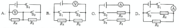 (1)、分析表中数据,推测第7至9次实验选择的玻璃管的横截面积为厘米2。(2)、比较1、2、3次实验数据可以得出结论。(3)、结合表格数据,分析计算图甲电热水器出水口加接的长管道横截面积为0.5cm2 , 若热水器接入电压为220V,人体的电阻为2000Ω,要使通过人体电流不超过10mA,则该管道长度不小于cm。(4)、若在测"隔电电阻"阻值时,缺少电流表或电压表,可以通过增加一个阻值已知的定值电阻R1和开关来解决,下面的四种方案中哪一个是错误的。 -