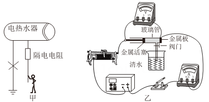 14、如图甲所示的电热水器金属内胆出水口加接了一段长管道,由于长管道中水柱具有电阻(简称“隔电电阻”),在电热水器漏电且接地线失效时,能形成“防电墙”保际人的安全。为了探究“隔电电阻”阻值大小的影响因素,兴趣小组利用注水的玻璃管模拟“隔电电阻”,设计图乙所示电路测出其阻值,并且打开阀门,通过向左移动活塞,改变玻璃管内水柱的长度,以及用不同横截面积的均匀玻璃管重复实验,得到如下数据。