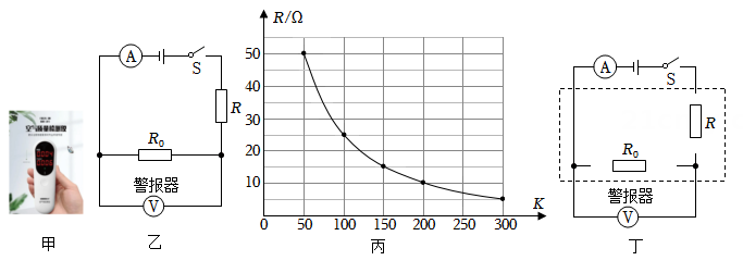 6、空气质量指数是确保碧水蓝天的重要指标。图甲所示是某工业园设置的监测园区空气质量指数的仪器,其电路原理简图如图乙,用电流表显示空气质量指数,警报器(电压表改装)两端电压U0≥2V时会发出警报声,警示空气质量指数不达标。其中电源电压U为6V恒定不变,定值电阻R0=5Ω,气敏电阻R的阻值与空气质量指数K的关系如图丙所示。(1)、气敏电阻R的阻值随空气质量指数K的增大而;(2)、当电路中电流为0.2A时,空气质量指数K为多少?(3)、空气质量指数K达多少时,会触发警报器发出警报?(4)、若园区提高环保等级,要求空气质量指数K达100时就触发警报。为了达到这一标准,应增加一个定值电阻R1改装电路。请你在图丁中补全改装后的电路,并通过计算求解R1的阻值为多少Ω。(若结果不能整除,保留一位小数)