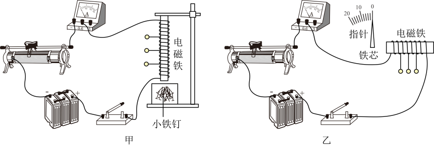4、为了研究“电磁铁磁性的强弱跟哪些因素有关”,小科利用电源、电流表、开关、滑动变阻器、导线、细铁钉、指针(带刻度)、电磁铁(用漆包线制作的一个六抽头电磁铁,每20匝抽出一个接线端)等器材设计了如图甲、乙所示的装置进行探究。(1)、图甲实验中小科是根据 来判断磁性的强弱。(2)、如图乙,电磁铁通电时,电磁铁的右端是 (填“S极”或“N极”)。(3)、与甲图实验方案相比,乙图实验方案的优点是 。(4)、小科利用图乙实验装置研究电磁铁磁性强弱与线圈匝数关系的实验。当线圈匝数从10匝换成100匝后,接下来应该进行的操作是:。