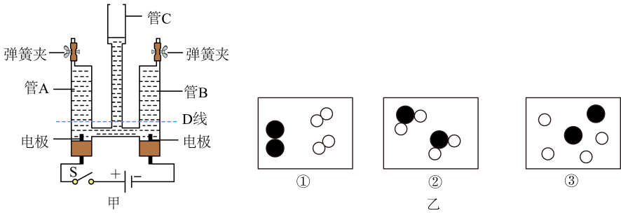 9、某同学制作了如图甲所示的简易电解水装置,进行家庭小实验(注:该装置气密性良好,且反应一段时间后停止通电,A.B管内液面均高于图中D线)。请根据要求回答问题。(1)、闭合开关S后,可以观察到两个电极上均产生了气泡。等A.B玻璃管内收集到一定体积的气体后关闭电源。若用燃着的木条检验A管中的气体,看到的现象是;B管中的气体为(填写化学式);A管中气体与B管中的气体质量比是。(2)、查阅资料得知“同温同压下,气体的体积比等于气体的分子个数比”,则该实验中能够说明“水分子中氢、氧原子个数比为2:1”的实验现象是。(3)、图乙是电解水的微观示意图,其中①②③的正确的顺序是。(4)、实验结束后,小科和同学一起得出结论,水由组成,水电解的文字表达式为。