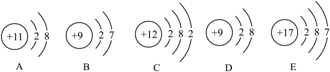 12、根据下列粒子的结构示意图,回答问题。(1)、属于同种元素的粒子是(填字母)。(2)、属于阴离子的是(填字母),A粒子所属元素位于元素周期表第周期。(3)、B和E两种原子的相同,所以它们具有相似的化学性质。(4)、请写出仅由AE两种元素构成的化合物:(填化学式)。