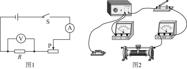20、某兴趣小组同学利用如图1所示电路图探究“电流与电压的关系”,实验中电源电压保持4 V不变,定值电阻R的阻值为5Ω,滑动变阻器的规格为“20Ω 0.5A”。(1)、请在图2中以笔画线代替导线完成电路连接,要求:滑动变阻器滑片向左移时电流表示数变大,电压表使用大量程(测量时再选择合适的量程),电压表测量R 两端的电压;(2)、该同学完成了预先设计好的表格中的4次实验,将得到的实验数据填入表格。