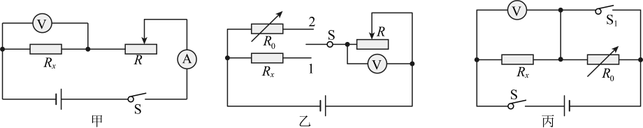 1、在测量未知电阻R,(阻值约为150Ω)的实验中,提供的实验器材有:电源(电压3V)、滑动变阻器R(0~50Ω)、电阻箱 R。(0~9999Ω)、电流表(0~0.6A)、电压表(0~3V)、开关及导线若干。(1)、小宝同学设计了图甲所示的电路,不能较准确测出R,的阻值,理由是;(2)、大宝同学设计了图乙所示的电路进行测量,正确连接电路后,小明先将开关S拨至 , 调节变阻器的滑片至某一位置记下此时电压表的示数U1;再将开关S拨至另一位置,调节电阻箱,使电压表的示数恰为U1 , 记下电阻箱的示数为R,此时 。(3)、该同学又设计了如图丙所示的测量电路,同样可以测量未知电阻,其中R。是定值电阻,请在空格内把实验步骤补充完整。