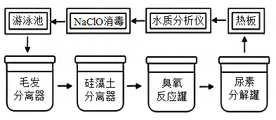 2、如图所示为杭州奥体中心游泳馆水循环系统,该系统使游泳馆实现常年“不换水”的同时水质完全符合国际赛事标准,充分体现了杭州绿色亚运的理念。下图为奥体游泳馆循环系统工作流程示意图。(1)、水经过毛发分离器和硅藻土分离器,初步完成了水体不溶性杂质的去除,此过程用到的物质分离方法为。(2)、水循环系统中用来消毒的NaClO, 用烧碱氯化法制取, 其反应原理为X+2NaOH=NaCl+NaClO+H2O,则X的化学式为。(3)、水经过臭氧反应罐和尿素分解罐,初步完成了水体的消毒(利用臭氧强氧化性)和有机物的去除,则此过程属于(选填“物理”或“化学”)变化。